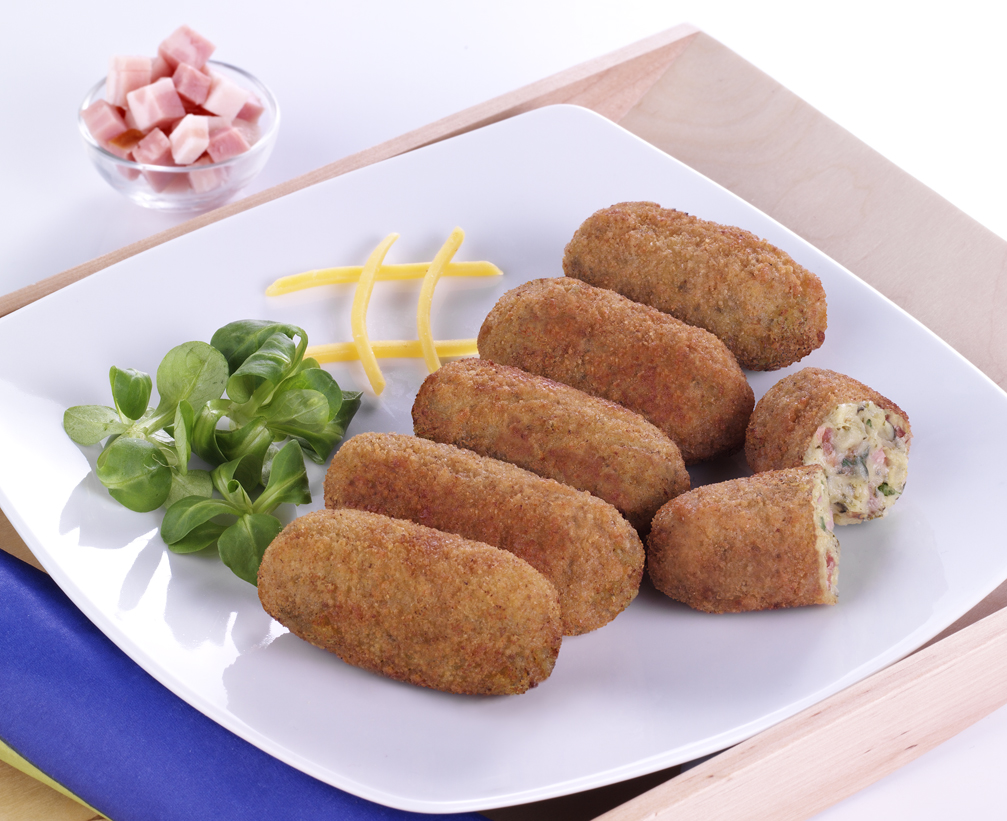 Producto elaborado a base de bechamel, a la que se incorporan el resto de ingredientes que identifican al producto (bacón, queso cheddar y espinacas), formado como croqueta, empanado y congelado.