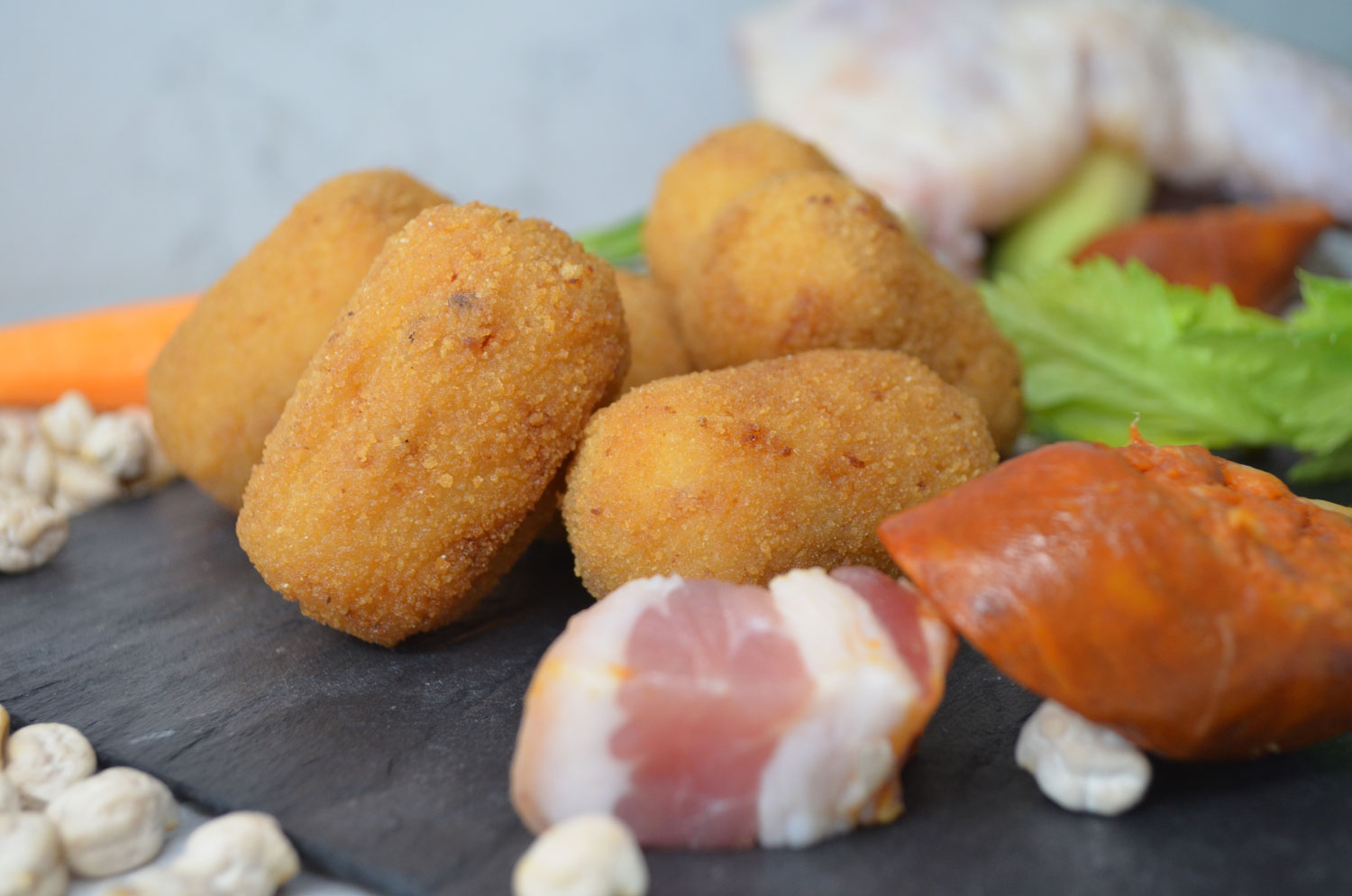 Producto elaborado a base de bechamel, a la que se incorporan el resto de ingredientes que identifican al producto (gallina, pollo, cerdo, vacuno, jamón curado), formado como croqueta, empanado y congelado